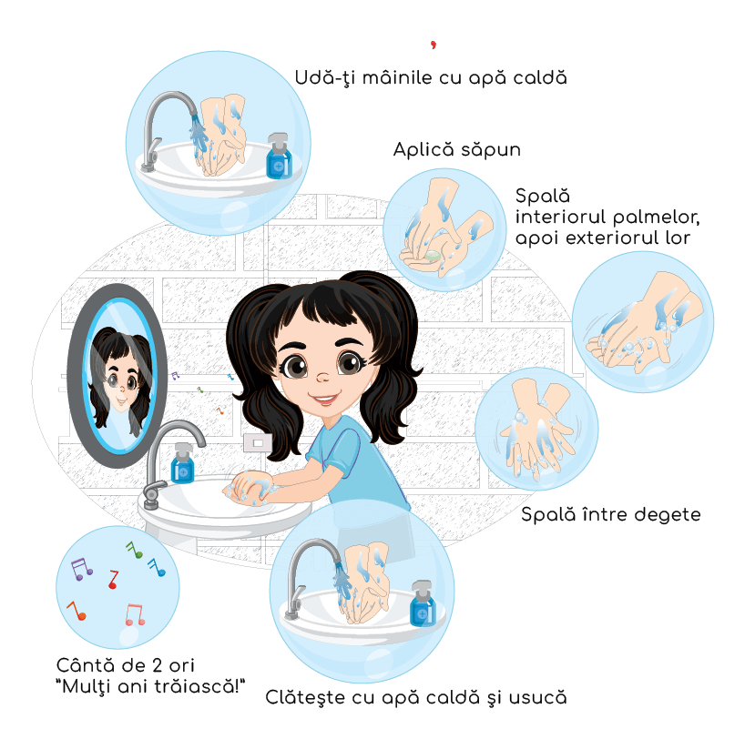 REGULA DE AUR! Spălatul mâinilor se face folosind săpun solid sau lichid și apă caldă sau rece, care curge, urmând pașii: